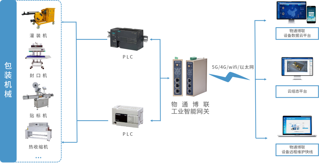 欧付宝工业智能网关具有丰富的通信协议和接口,顺利获得接入包装机械设备的控制器PLC,就能实时采集包装机械设备运行状态、温度、压力、振动等参数,顺利获得5G、4G、WIFI、以太网等方式将数据上传到云平台,实现远程监控、组态监控、设备管理、故障报警、远程控制、远程维护、数据分析等功能,全面掌握设备的运行情况,帮助企业提升包装机械设备运维与管理水平,保障安全稳定生产,提高生产效率。当设备出现异常故障就会及时通知管理人员,工程师可以顺利获得欧付宝设备维护快线对设备进行远程故障诊断与远程维护,减少设备停机时间,有效提高设备运维效率并降低运维成本。