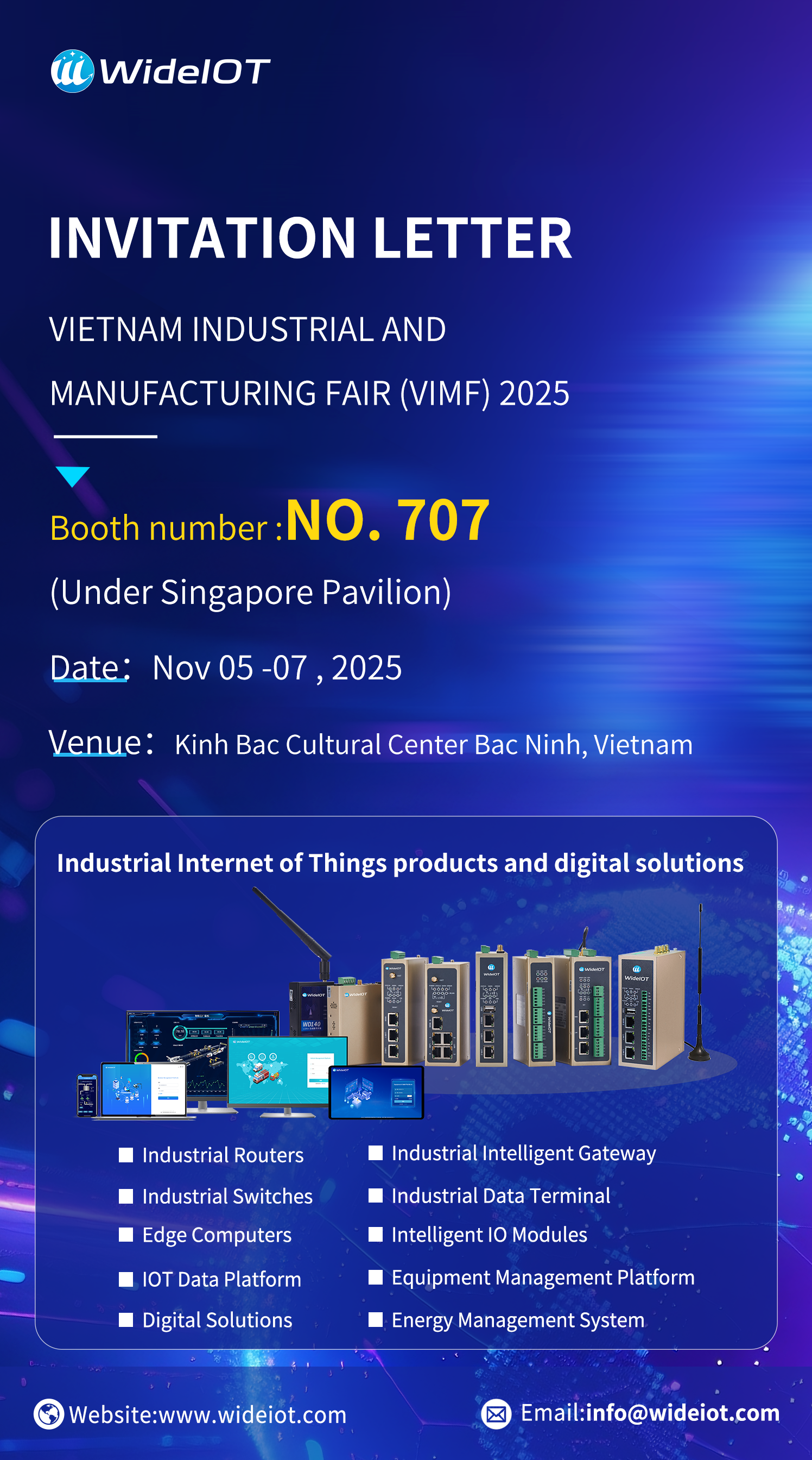 欧付宝(WideIOT)将在展会现场展示工业路由器(Industrial Routers)、工业交换机(Industrial Switches)、工业智能网关(Industrial Intelligent Gateway)、工业数采终端(Industrial Data Terminal)、工业数据云平台(IOT Data Platform)等等工业物联网产品和数字化解决方案,与您共探智能制造新机遇!