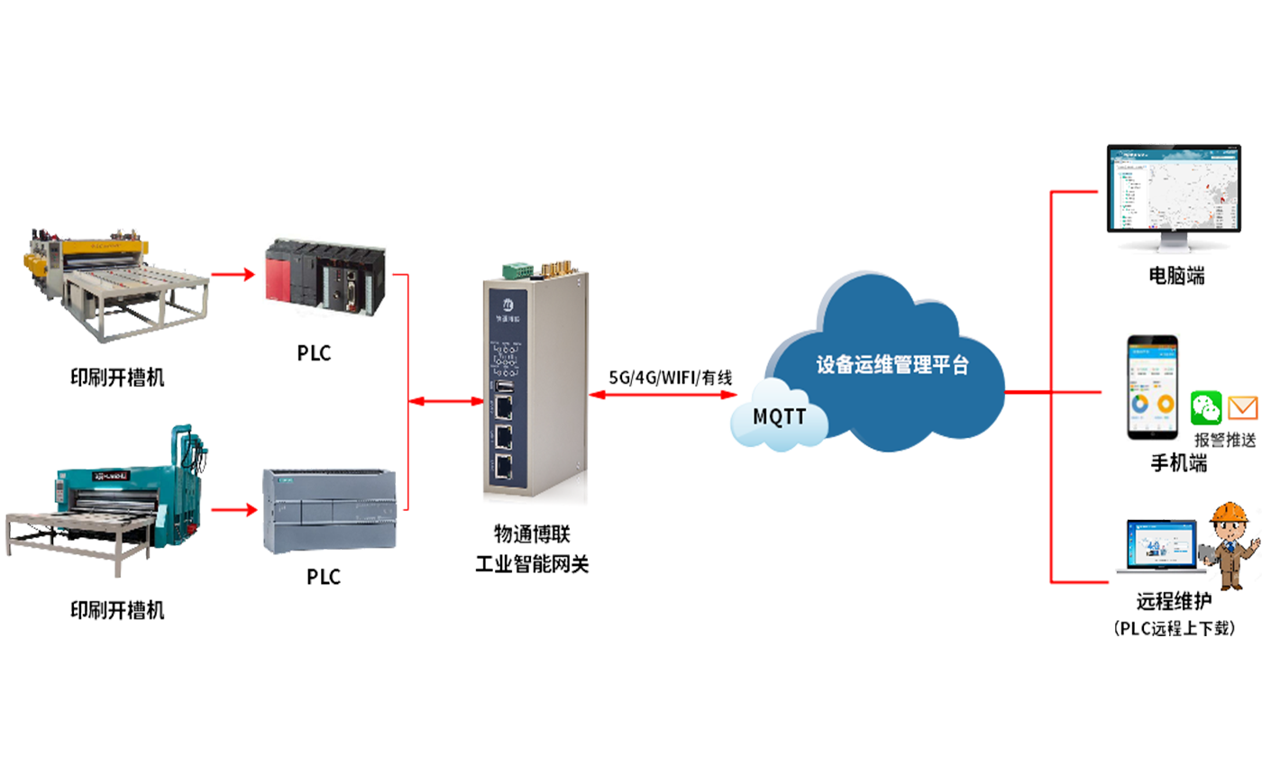 欧付宝利用WG系列工业智能网关作为连接设备和监控系统的桥梁,实现印刷机械设备数据的远程监控和维护,为印刷企业给予更加智能化的印刷机械设备远程监控智能运维解决方案。