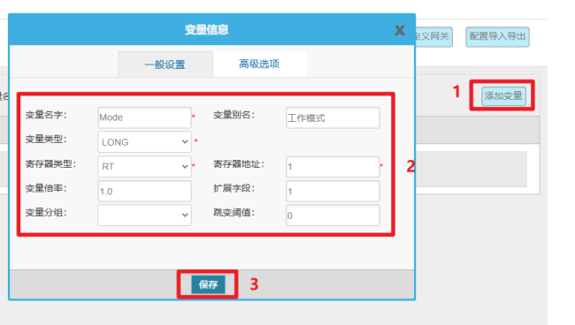 注意:数采网关LAN口地址必须与CNC IP处于同一网段且不冲突,保证网关可以Telent通CNC (IP与端口)。如果Telent不通,可查看本手册第28页“3.网关与CNC同网段配置”。 2.变量配置 变量配置主要是定义变量名(自定义内容,不可使用中文命名)、变量别名(自定义,可使用中文名字)、寄存器类型和寄存器偏移地址,并定义一些数据规则(如:倍率、小数点、单位、告警)。