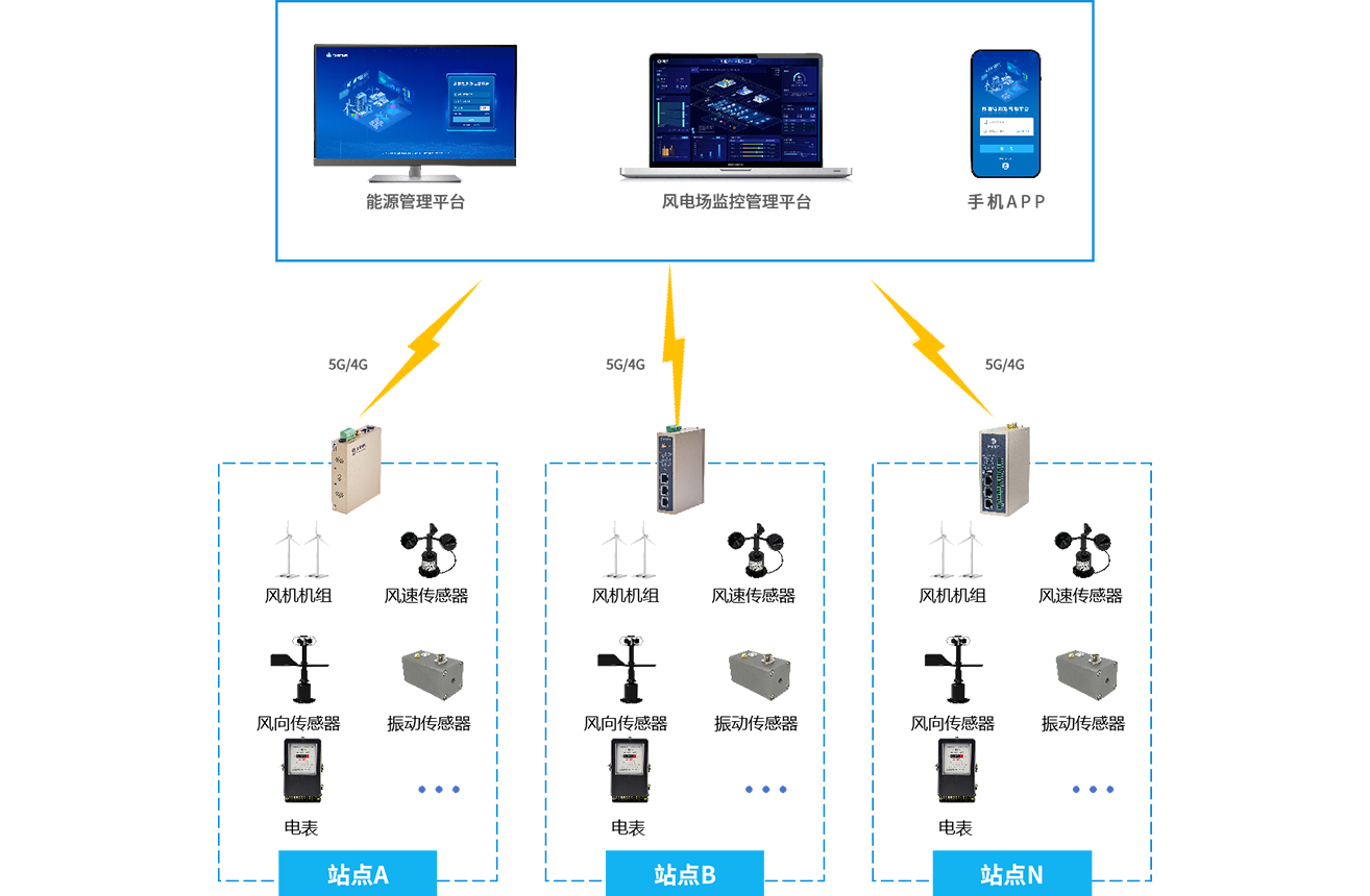 顺利获得欧付宝的工业智能网关采集风力发电场的每台风机和风速传感器、风向传感器、振动传感器等设备,将采集到的风机运行数据(如转速、功率、温度等)传输至风电场监控管理平台。平台对数据进行实时分析,监测风机运行状态,当检测到故障或异常时及时发出预警,并给予故障诊断和维修建议。同时支持远程控制风机启停、调整参数等操作,以及优化发电调度。